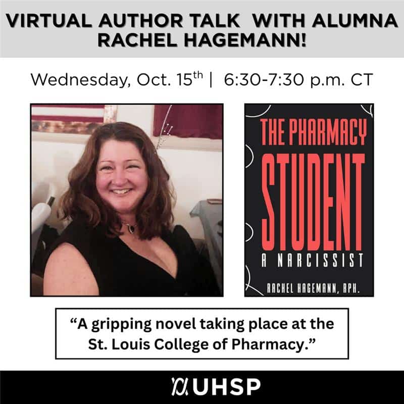 Reconnect with fellow alumni during an engaging virtual author talk featuring our very own Rachel Hageman B.S. '95 RPH! Dive into her captivating debut novel, The Pharmacy Student: A Narcissist, set against the backdrop of the St. Louis College of Pharmacy at UHSP. This powerful story unravels the lives of a close-knit group of students as they navigate the profound impact of losing a friend unexpectedly. Join us for an insightful discussion where you can ask Rachel questions about her writing journey, share your own experiences from your time at the College, and reflect on how those days shaped your path.